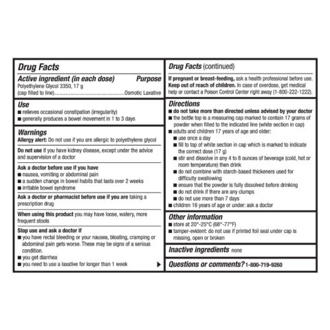 The unflavored laxative powder dissolves in any beverage. Do not combine with starch-based thickeners used for difficulty swallowing. When using this product you may have loose, watery, more frequent stools. Available without a prescription for once-daily dosing.