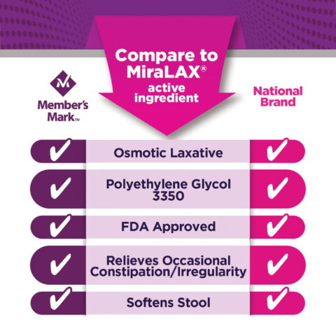 Member’s Mark ClearLAX Polyethylene Glycol 3350 Powder for Solution, Osmotic Laxative, gets your sluggish digestive system moving again by relieving occasional constipation (irregularity).