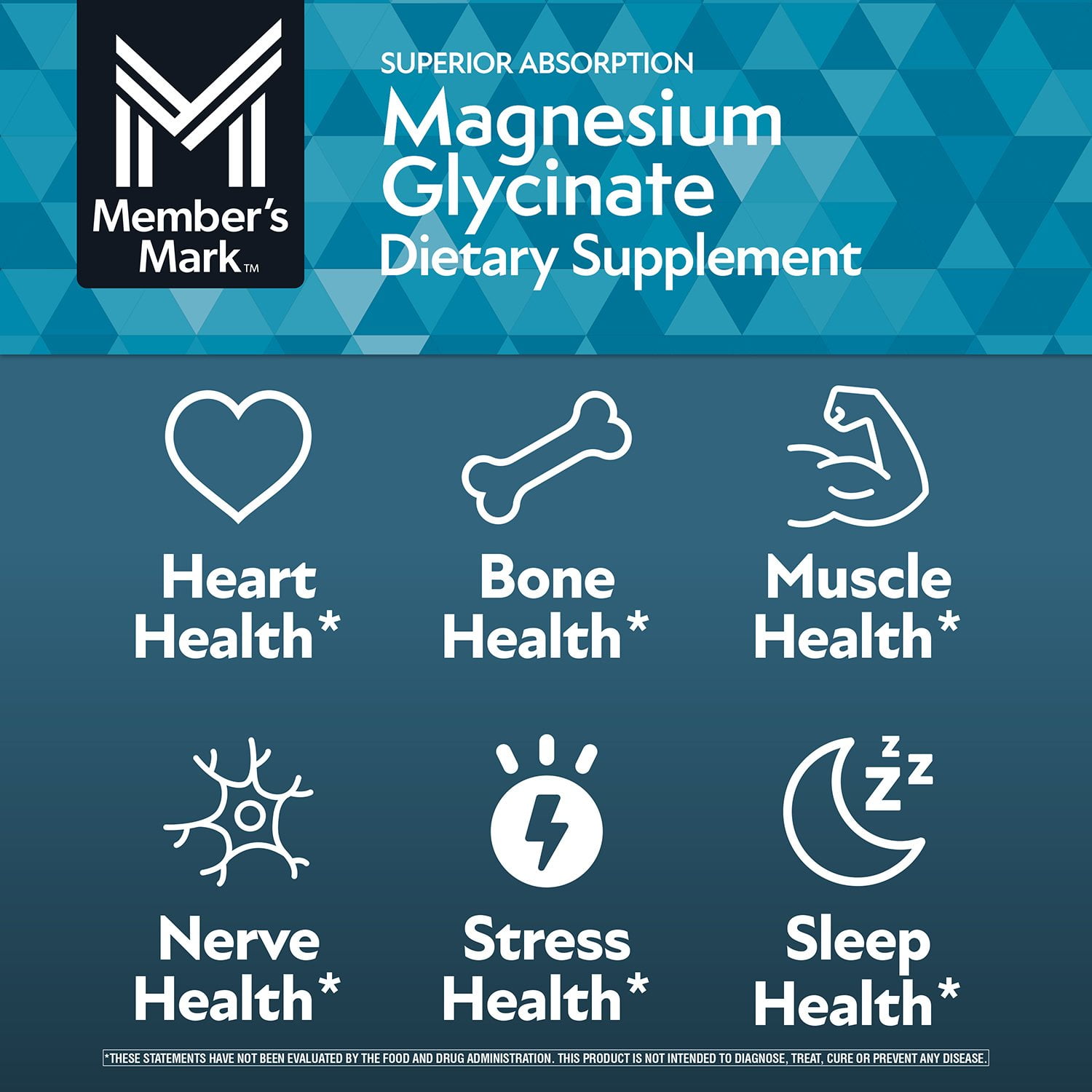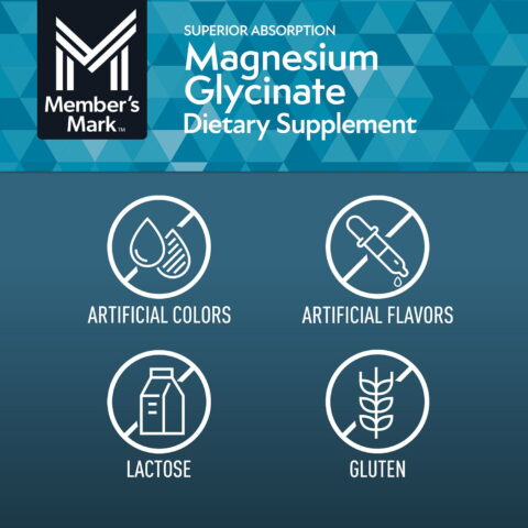 The key ingredients in Member’s Mark™ Magnesium Glycinate Plus L-Theanine Tablets work together to support your heart, bone, nerve, and muscle health and help the body relax without inducing drowsiness.*