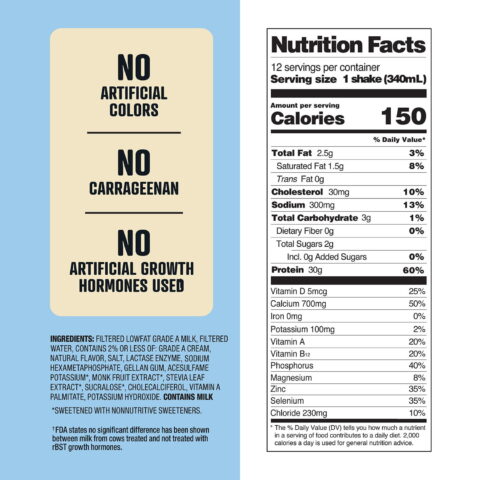 This vanilla shake is free from artificial colors, ensuring a clean and natural product. Additionally, it is rBST/rBGH-free, gluten-free, lactose-free, and certified Kosher-OU, catering to a variety of dietary preferences and restrictions.