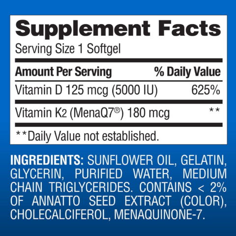 This formula features MenaQ7®, a clinically studied vitamin K2 which may help support healthy arteries, circulation, and blood flow.* Vitamin K2 as MK-7 and vitamin D both work to support bone and cardiovascular health.* Vitamin D plays an important role in supporting bone mineral density and healthy bone metabolism.* It may help increase the absorption of calcium, which is essential for maintaining strong and healthy bones.* Beyond its benefits for bones and muscles, vitamin D supports the upper respiratory tract, immune system, and brain health, providing comprehensive support for overall well-being.*
