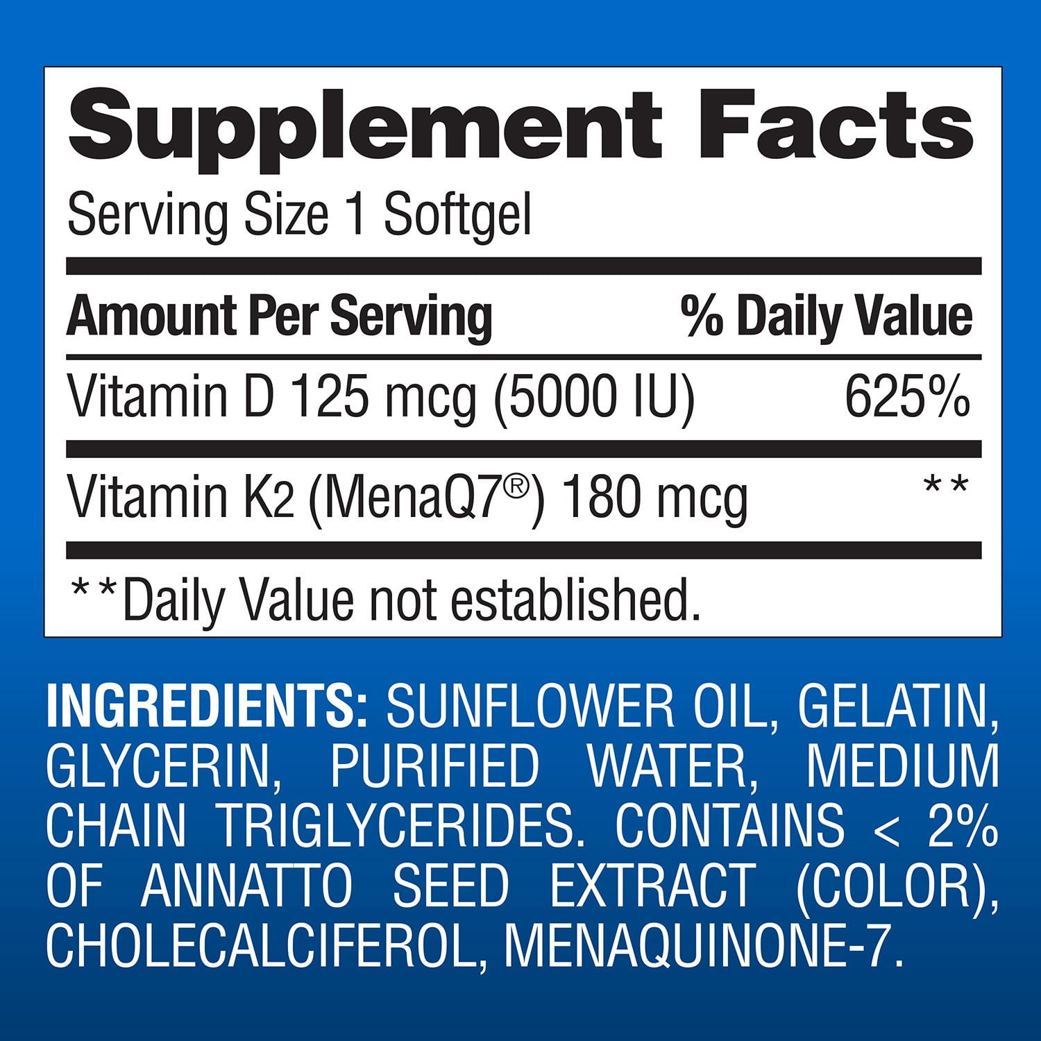Member’s Mark Vitamin K2 + D3 Softgels Dietary Supplement contain essential vitamins that help to support the health of your heart, muscles, bones, and immune system.* When taken as suggested, this product delivers 180 mcg of vitamin K2 and 125 mcg (equivalent to 5000 IU) of vitamin D per day. These softgels are free from gluten, synthetic colors, artificial flavors, sugar, and lactose. Adults should take one softgel daily, preferably with a meal, as a dietary supplement. Manufactured and packaged in the United States, this product contains 150 softgels, providing you with a 5-month supply.