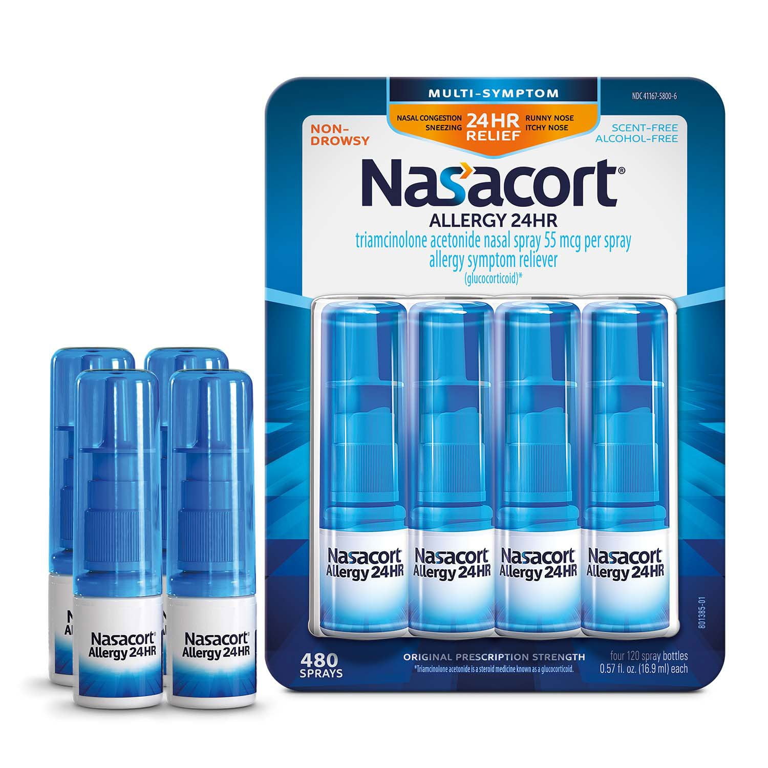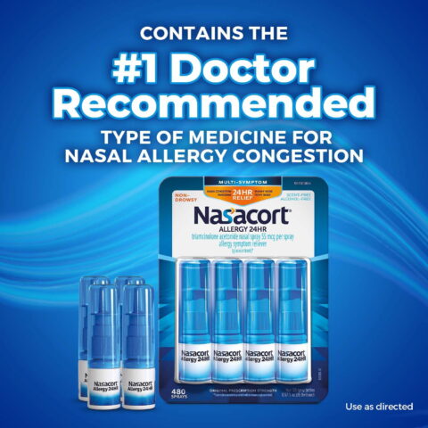 Nasacort contains the #1 doctor recommended type of medicine for nasal allergy congestion. Unlike an antihistamine, this allergy relief nasal spray starts working at the source by blocking more of the chemical responses that can cause nasal allergy symptoms, to relieve even your worst nasal allergy symptoms, including nasal congestion, sneezing, and runny or itchy nose for a full 24 hours.