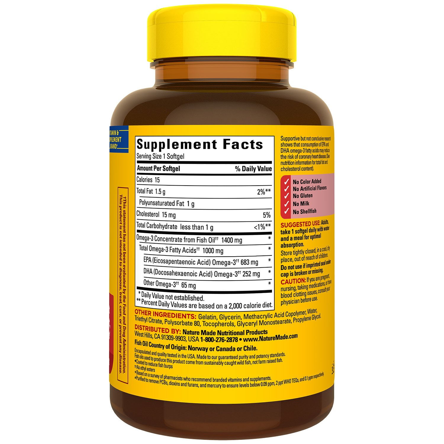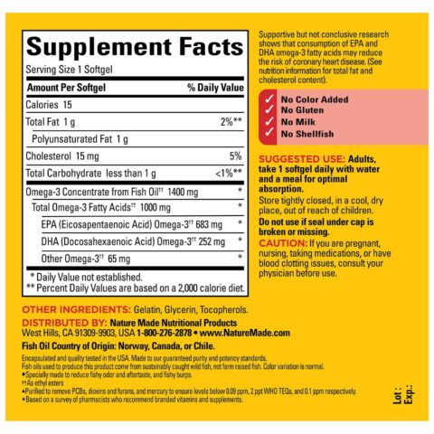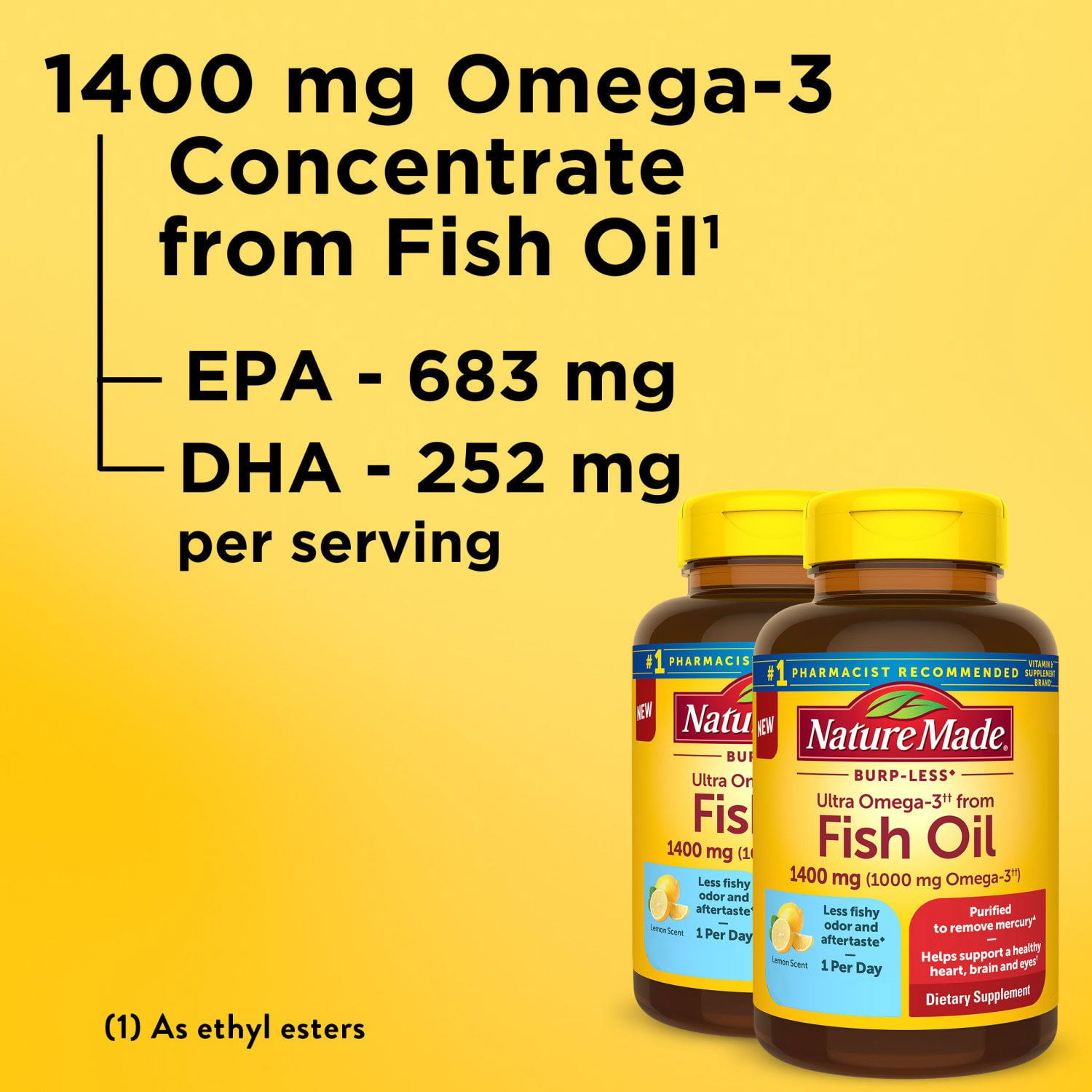 For optimal absorption, adults are recommended to take one Nature Made Ultra Fish Oil 1400 mg (1000mg Omega-3) softgel daily with water and a meal. The softgels are specially made to reduce fishy odor, aftertaste, and fishy burps, making them easy and pleasant to consume.