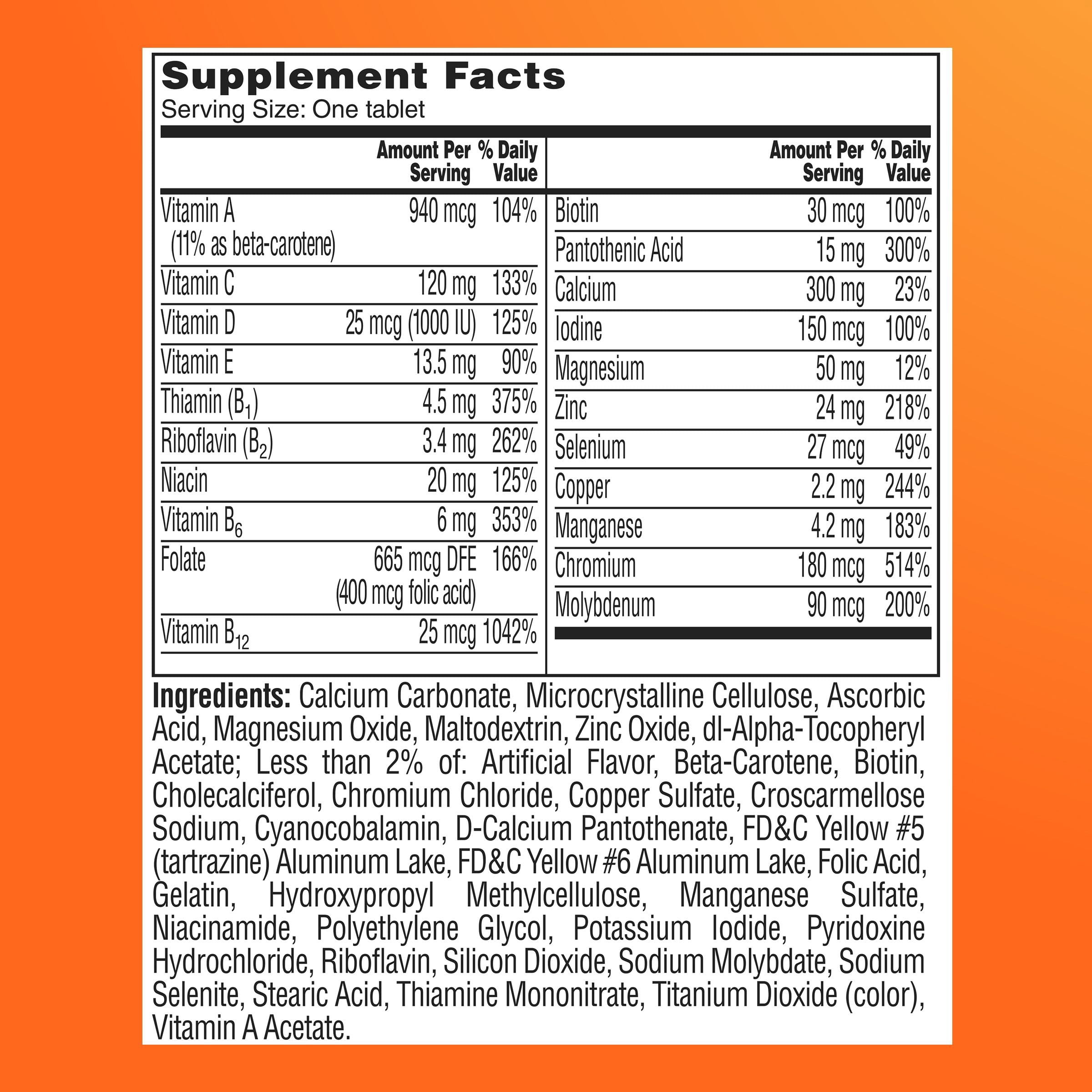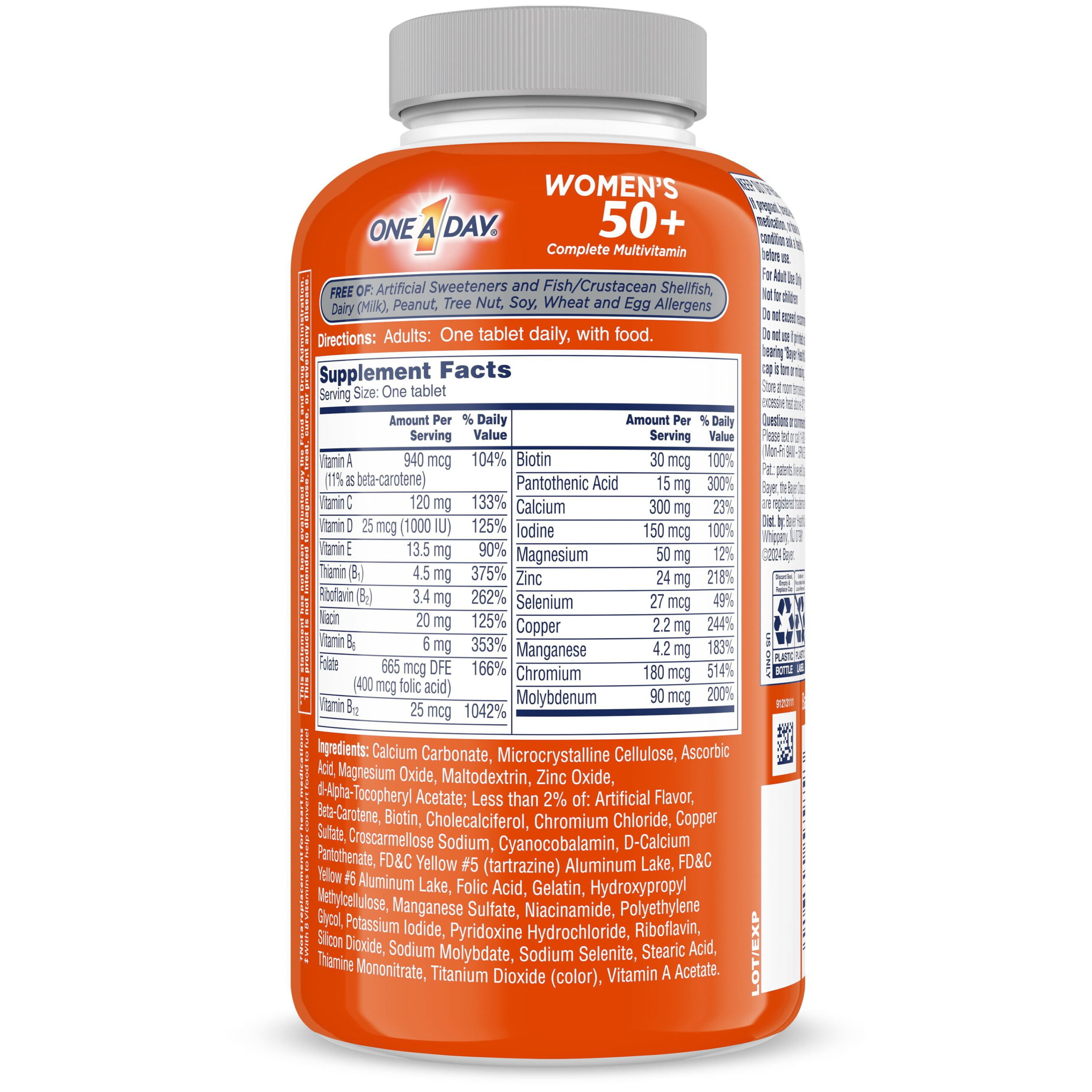 Our women multivitamin tablet is free of egg, dairy (milk), soy and wheat allergens, artificial sweeteners, artificial flavors and high fructose corn syrup. Add One A Day multivitamin for women 50+ into your lifestyle to provide nutritional support you may need. Adults, One tablet daily, with food.