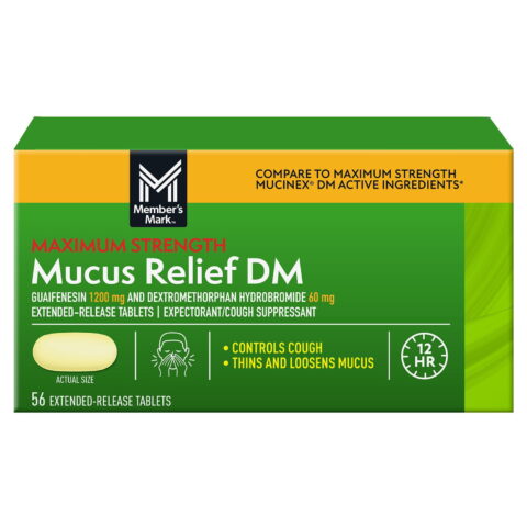 Member's Mark Maximum Strength Mucus-DM Guaifenesin and Dextromethorphan Hydrobromide Extended-Release Tablets, 1200 mg/60 mg, 56 ct.