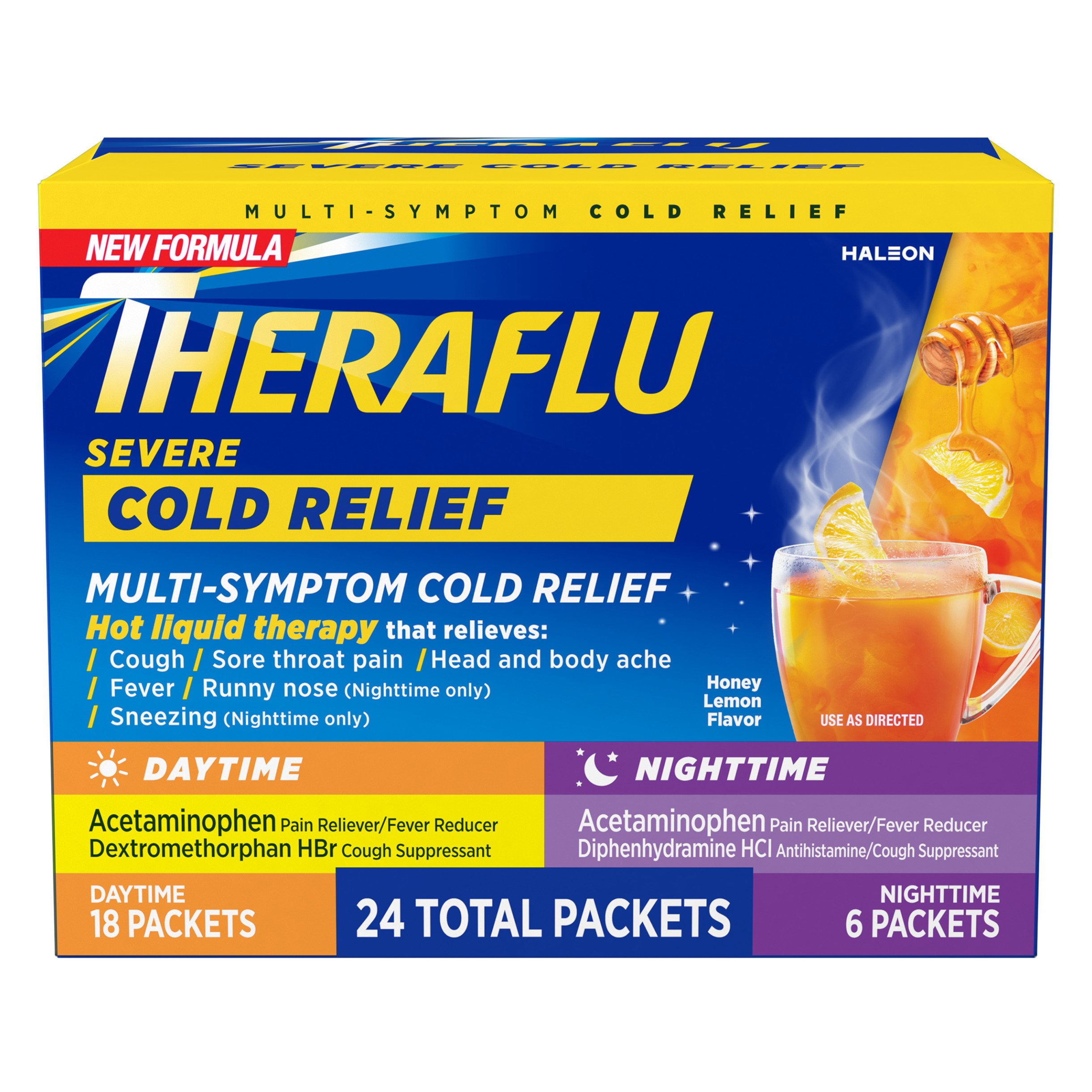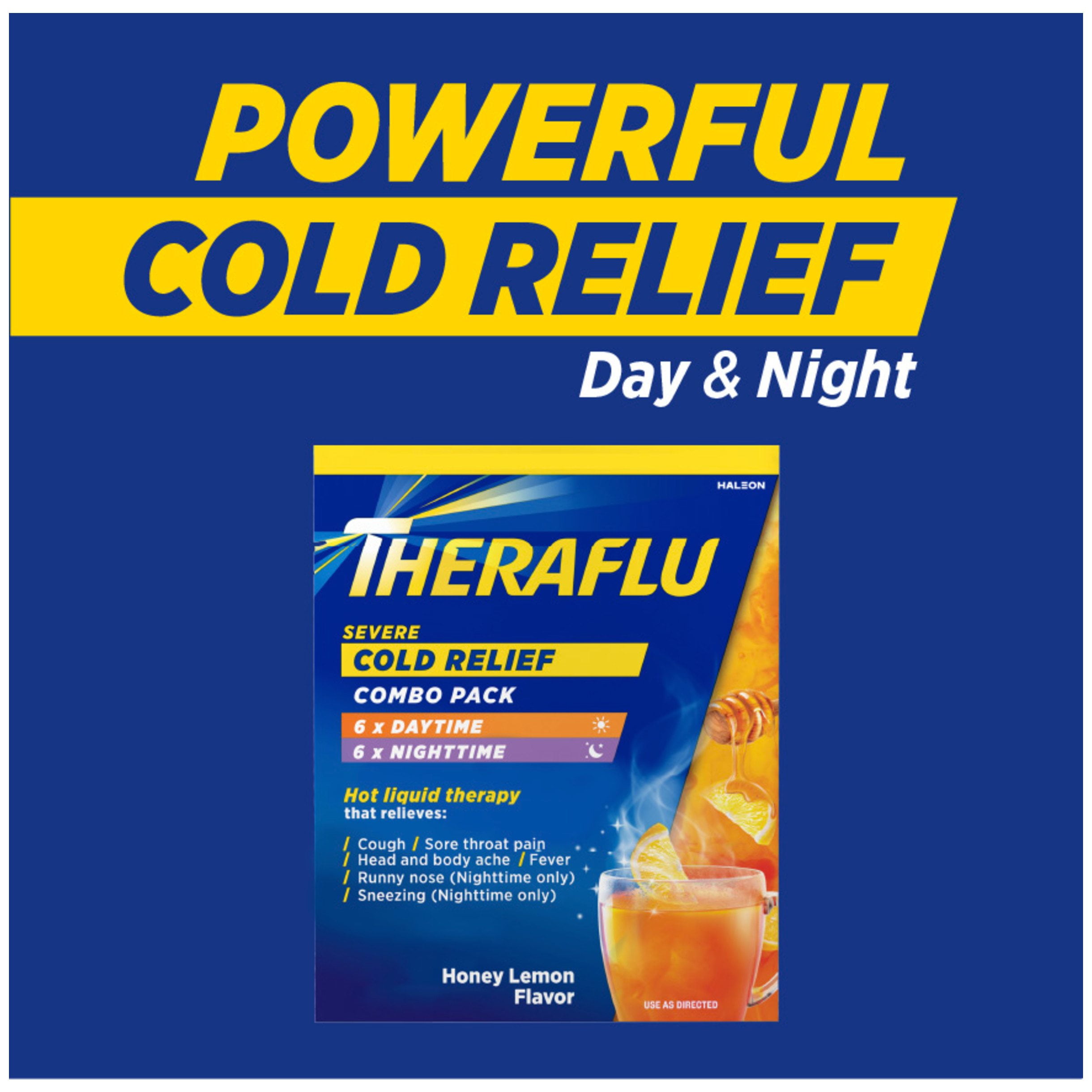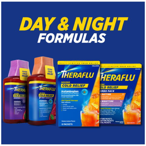 The Theraflu Multi-symptom Severe Cold Medicine and Nighttime Severe Cold and Cough Medicine come in a value pack. This ensures that you have effective relief on hand to combat your worst cold and flu symptoms all day and all night.