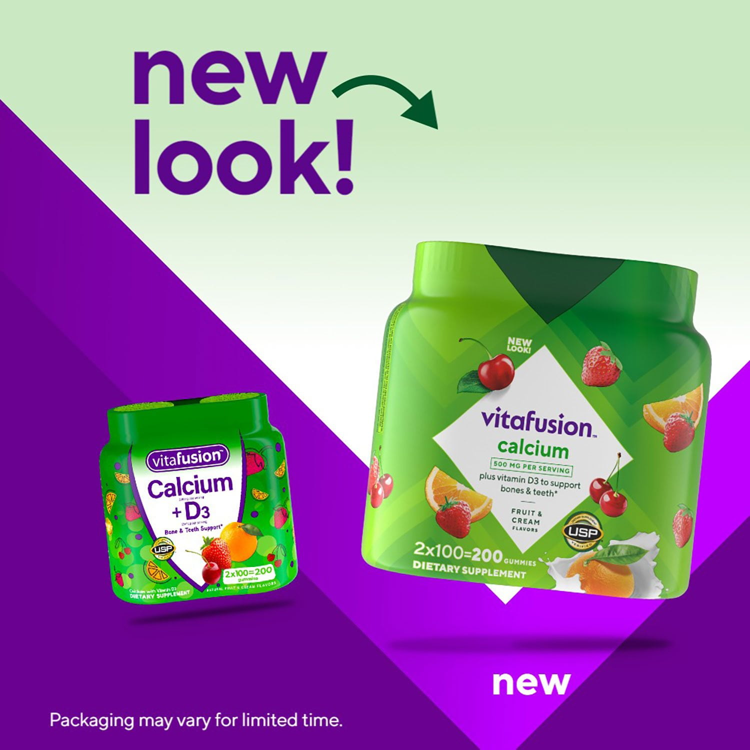 • Two 100 count bottles of vitafusion Calcium Gummy Vitamins, fruit and cream flavored supplements, enough chewable Calcium vitamins for 100 days
