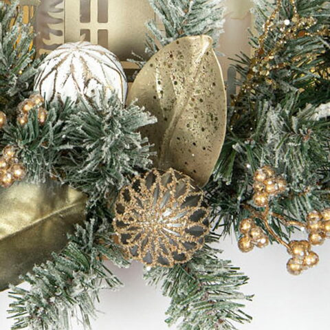 Make your front door or mantel festive with this Member’s Mark 24″ Pre-Lit Village Wreath. Crafted with softly flocked spruce and bristle pine, it features gold-glittered magnolia leaves, champagne magnolia leaves with gun metal gray antiquing, gold-painted berries, and white twigs. The wreath is adorned with ornaments in various sizes, shapes, and finishes, including warm gold with white-washed finish, wood grain, gun metal gray with wood chip finishing, champagne mercury with gold accents, and sand-blasted textures.