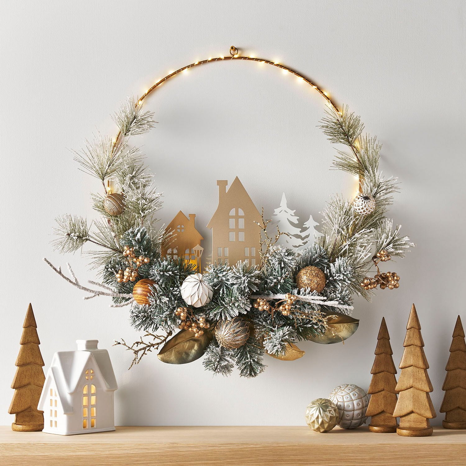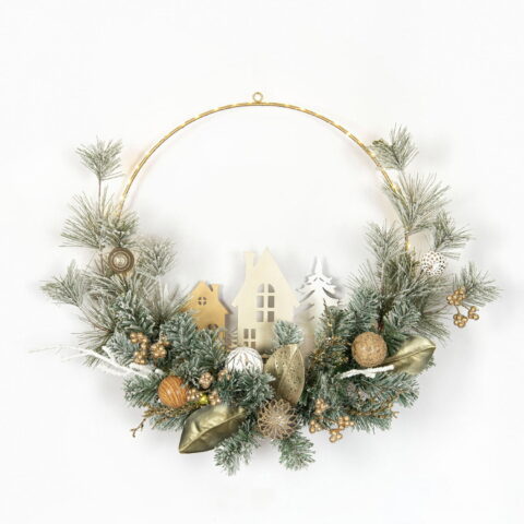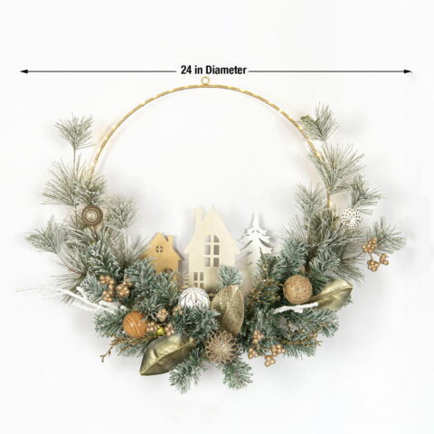 Adding a unique touch to the lush faux greenery is a small painted metal village nestled within the wreath. This delightful scene includes two houses and trees, creating a cozy and whimsical holiday display that will captivate your guests.