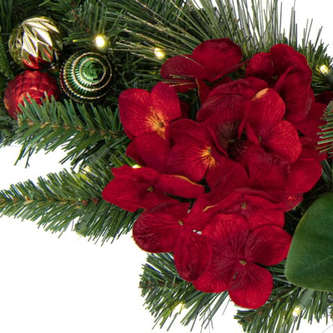 • Features a mix of lush, life-like faux greenery and various shatterproof ornaments