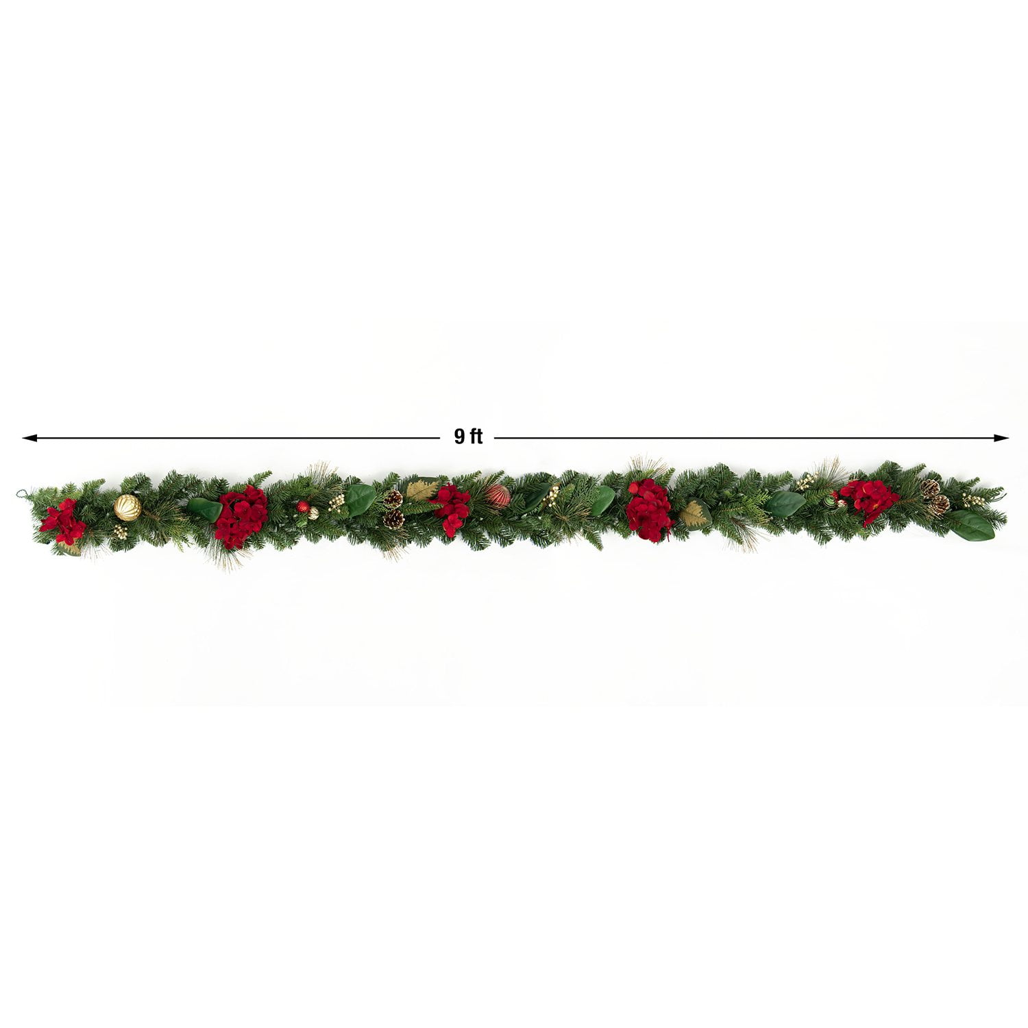 • Festive 9′ garland for mantles, banisters, and more