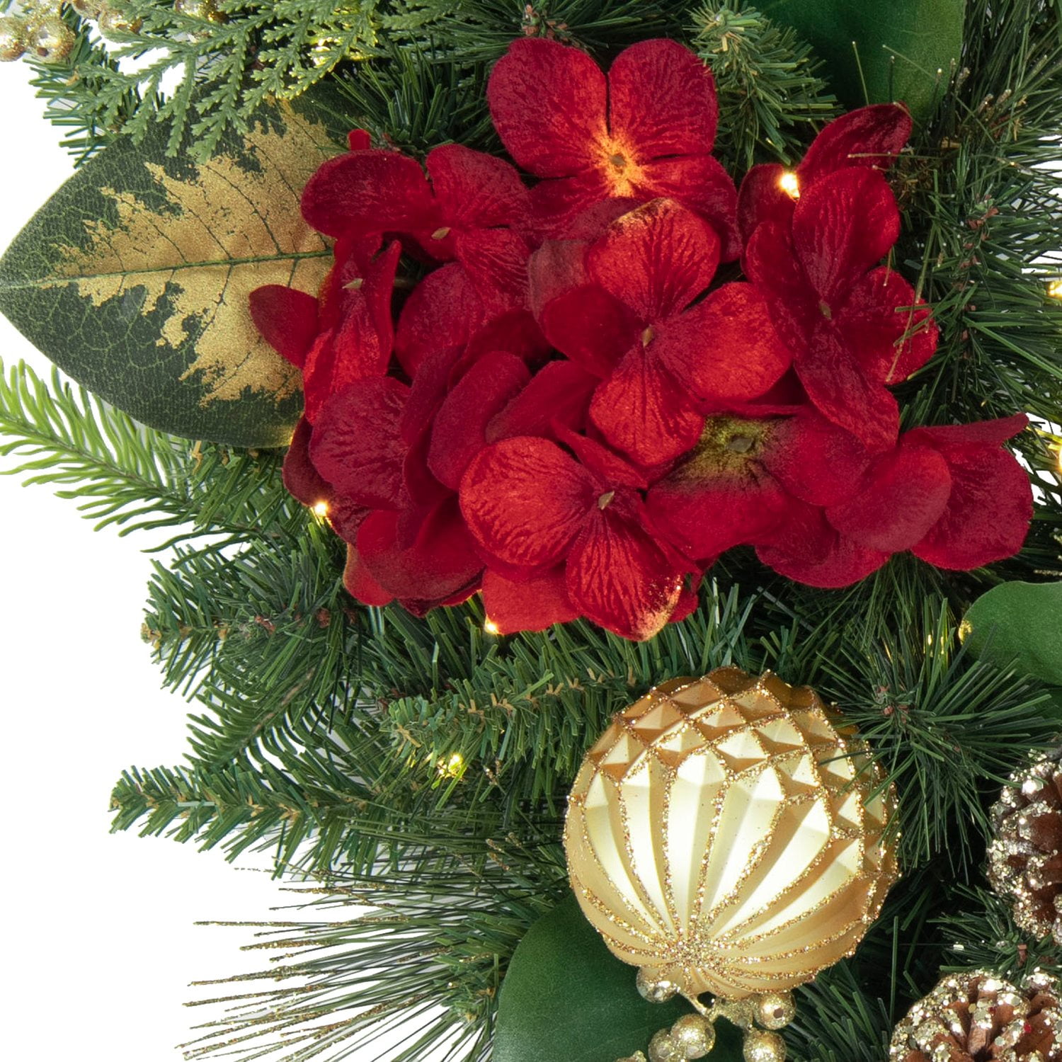 • Features a mix of lush, flocked faux greenery and various ornaments