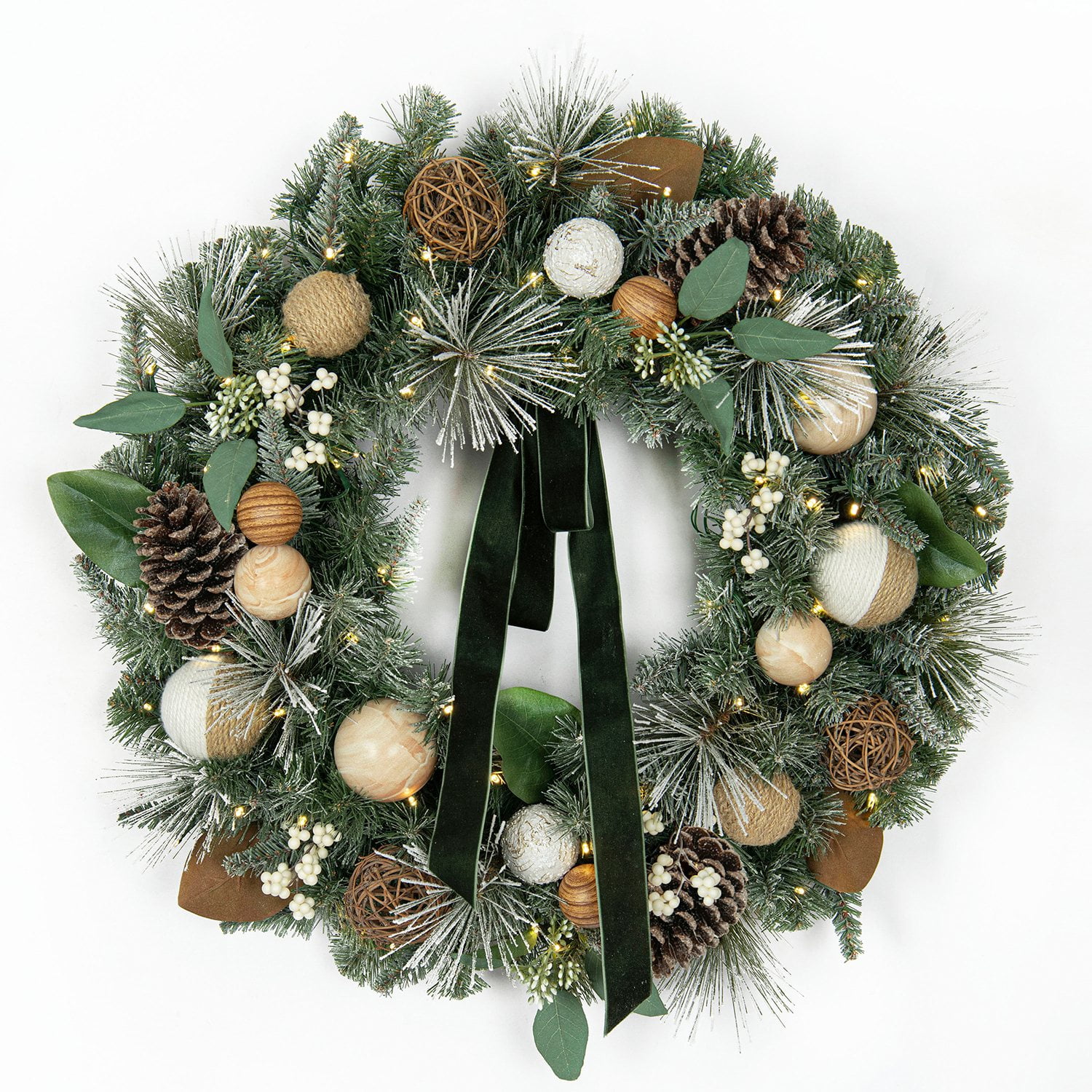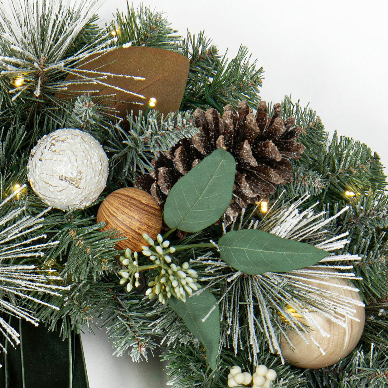 Enjoy hassle-free setup with 70 warm white LED lights pre-installed on each wreath. Powered by a battery pack, the lights operate on a timer for 6 hours on and 18 hours off, ensuring effortless illumination throughout the season. Four AA batteries are included, eliminating the need for cords or daily adjustments. Simply hang the wreath on any door or mantel and let it shine.