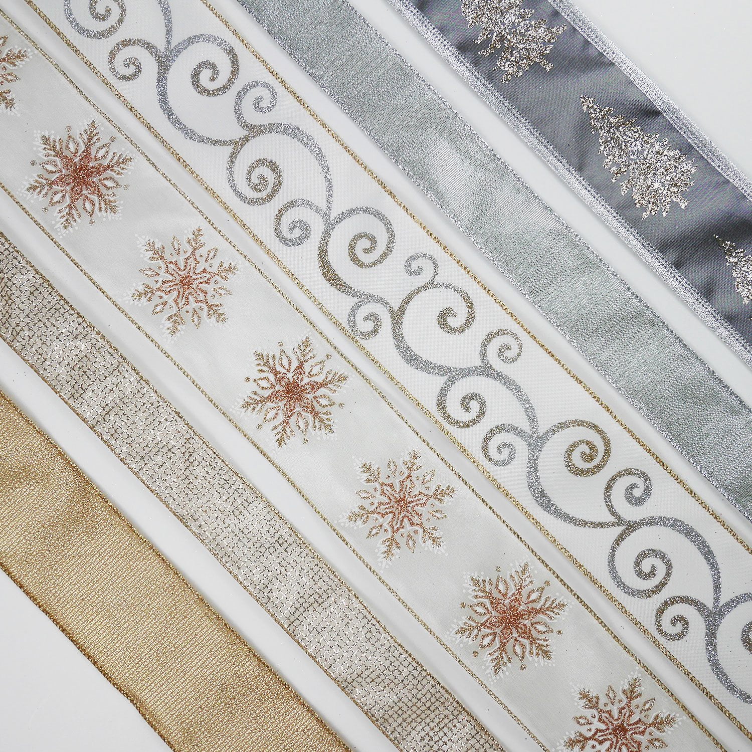 The Metallic Collection brings an elegant, upscale look to holiday décor in neutral shades designed to blend seamlessly into any home. This collection features a rich, tone-on-tone color palette of silver and gold mixed with a wintry white and a sophisticated gray for added contrast and depth. Included in the collection is an ivory satin ribbon featuring large sculptural swirls of gold and silver glitter. It pairs perfectly with the metallic burnished gold ribbon that shimmers even in candlelight. To capture the iconic look of the season, use the warm gray satin ribbon lined with glittering Christmas trees and edged in a daring metallic that simulates crushed diamonds. Layer it with the sheer ivory ribbon embossed with glittery snowflakes or with the thin sheer ribbon of vintage gold. Finish the look with a classic silver metallic ribbon that has showstopping shine.