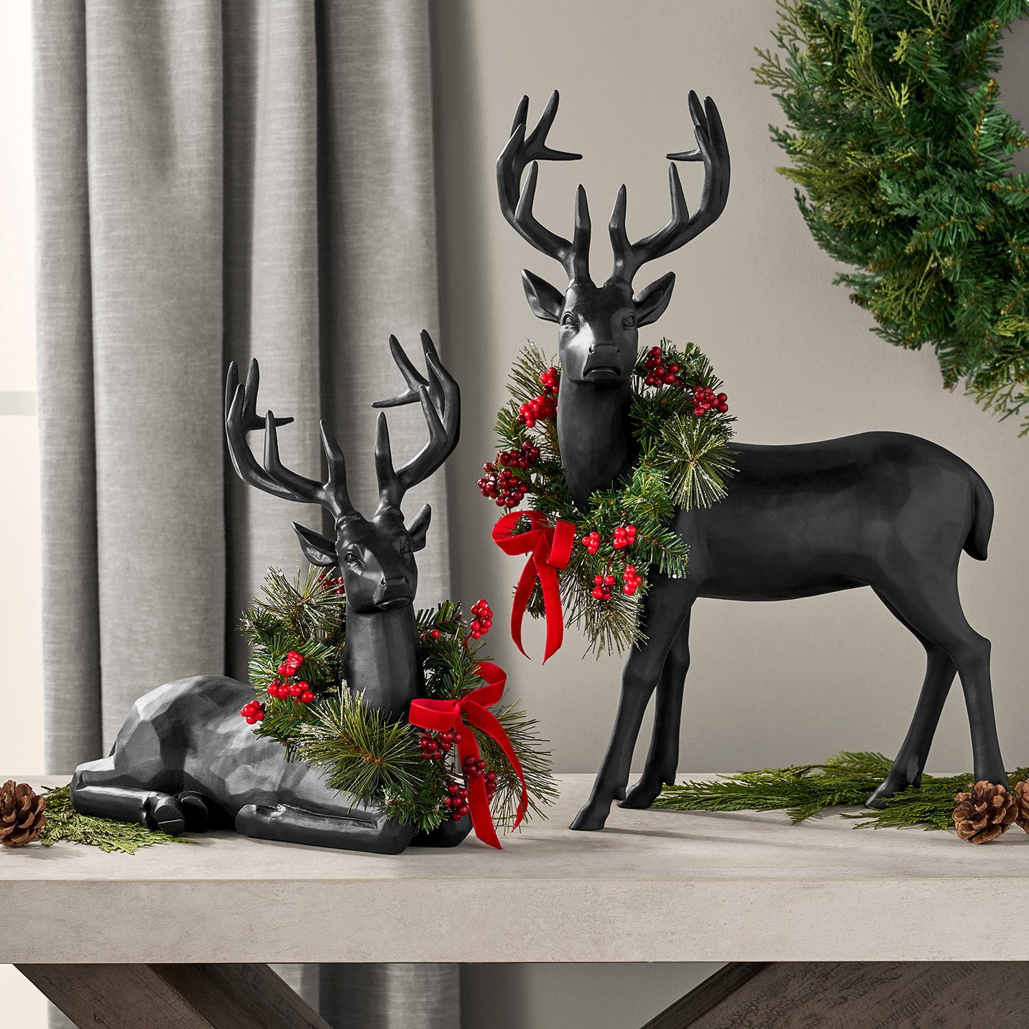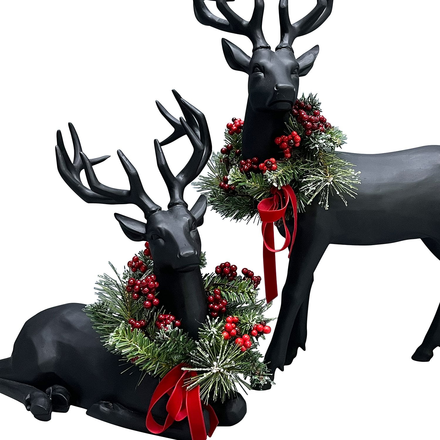 Each deer is adorned with a faux Noble fir and needle pine wreath, lightly glittered for a touch of holiday sparkle. The wreaths are embellished with vibrant red berries and finished with a striking red velvet ribbon, adding a festive charm to your décor. The set includes two deer in different poses—one standing and one sitting—creating a delightful and dynamic display.