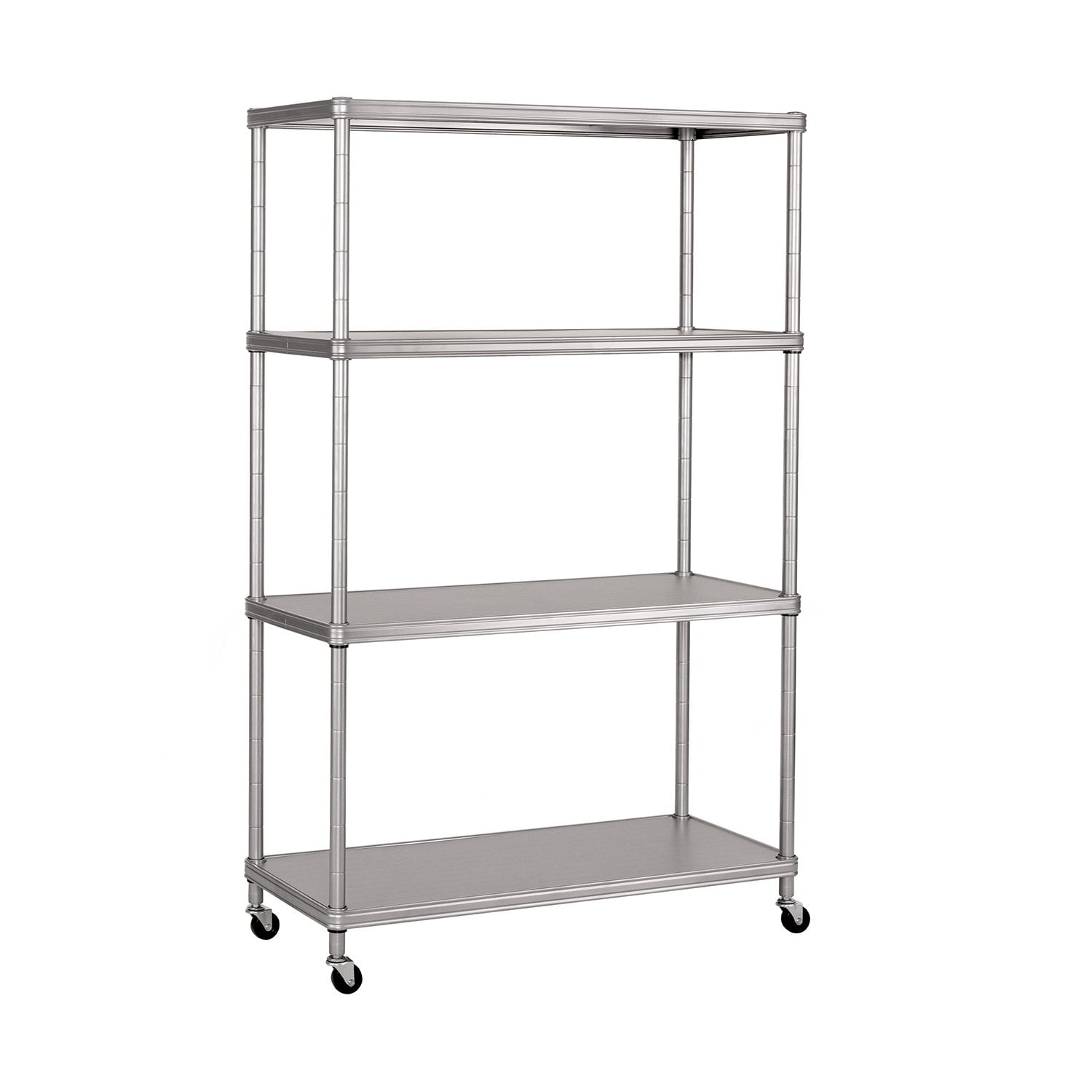 The shelving unit is built from commercial-grade steel. The four shelves feature a solid steel frame supported by solid steel wires. The 1-inch diameter steel poles feature an epoxy powder-coat finish that protects from corrosion in dry environments. The removable shelf liners are made of polypropylene. The 2” diameter wheels (2 locking) are made of rubber. The bonus leveling feet feature adjustable threaded ends and a sturdy rubber base to maximize the loading capacity.