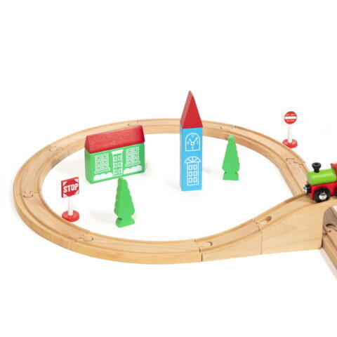 Talk about an amazing wooden train set! This 37 piece set has everything that you are wanting and needing in a train set. The engines pull the cars up and over the 3 piece bridge and back down all in a good days work on the railroad. This train set is an excellent starter set which is designed to keep the tracks together so that your little engineer can spend more time playing. Compatible with Thomas and Friends Wooden Railway, Melissa and Doug, Brio, KidKraft and other fine wooden Train Sets and Accessories.