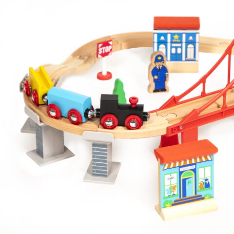 Talk about an amazing wooden train set! This 60 piece set has everything that you are wanting and needing in a train set. The engines pull the cars up and over then across the red suspension bridge and back down and through the tunnels all in a good days work on the railroad. This train set is very sturdy and its support system is designed to keep it together so that your little engineer can spend more time playing instead of trying to keep it together. Compatible with Thomas and Friends Wooden Railway, Melissa and Doug, Brio, KidKraft and other fine wooden Train Sets and Accessories.