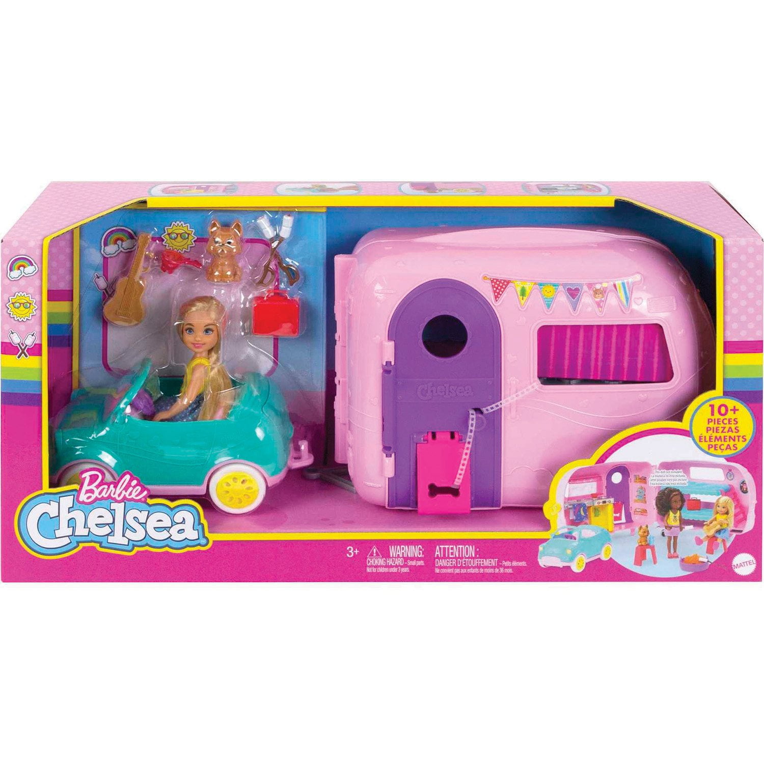 Chelsea™ doll and her adorable puppy are ready for endless camping adventures with the Club Chelsea™ Camper playset. This unique vehicle transforms into a campsite, offering a home away from home wherever your child’s imagination takes them. Hitch the camper to the convertible car for travel, and easily detach it when it’s time to set up camp.