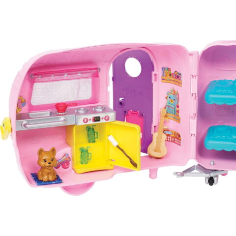 The camper opens up to reveal a fully equipped kitchen with a sink, stove, and fridge featuring a working door. Two bunk beds with a ladder provide cozy sleeping arrangements, while a doggie door lets Chelsea’s puppy come and go freely. With more than 10 toy pieces included, kids can create countless camping stories, from roasting marshmallows to singing campfire songs.