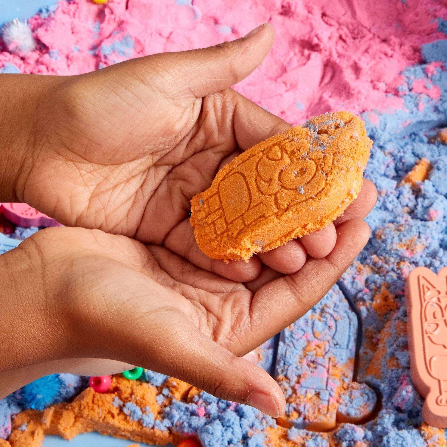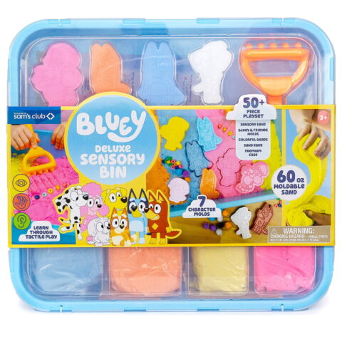Dive into a world of tactile fun with the Bluey Deluxe Sensory Bin! Packed with over 50 pieces, including 60 ounces of moldable sand, a mini rake, and themed mix-ins and molds, this sensory bin offers endless opportunities for imaginative play. Create Bluey, Bingo, Coco, and more with the included molds, or mix in fluffy poms and crunchy beads for a textured twist.