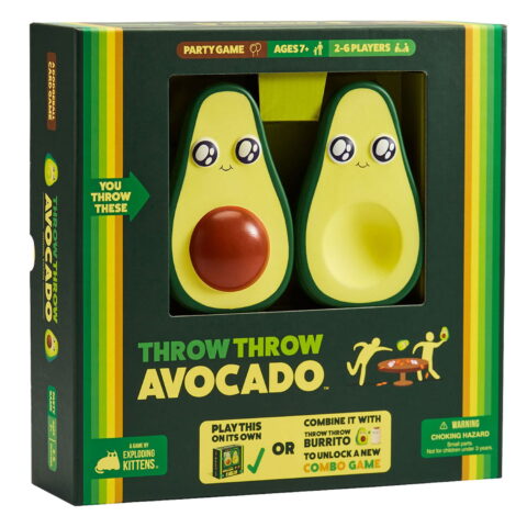 Throw Throw Avocado® from Exploding Kittens® is a dodgeball card game. You throw avocados at each other—the game is the sequel to Throw Throw Burrito®.