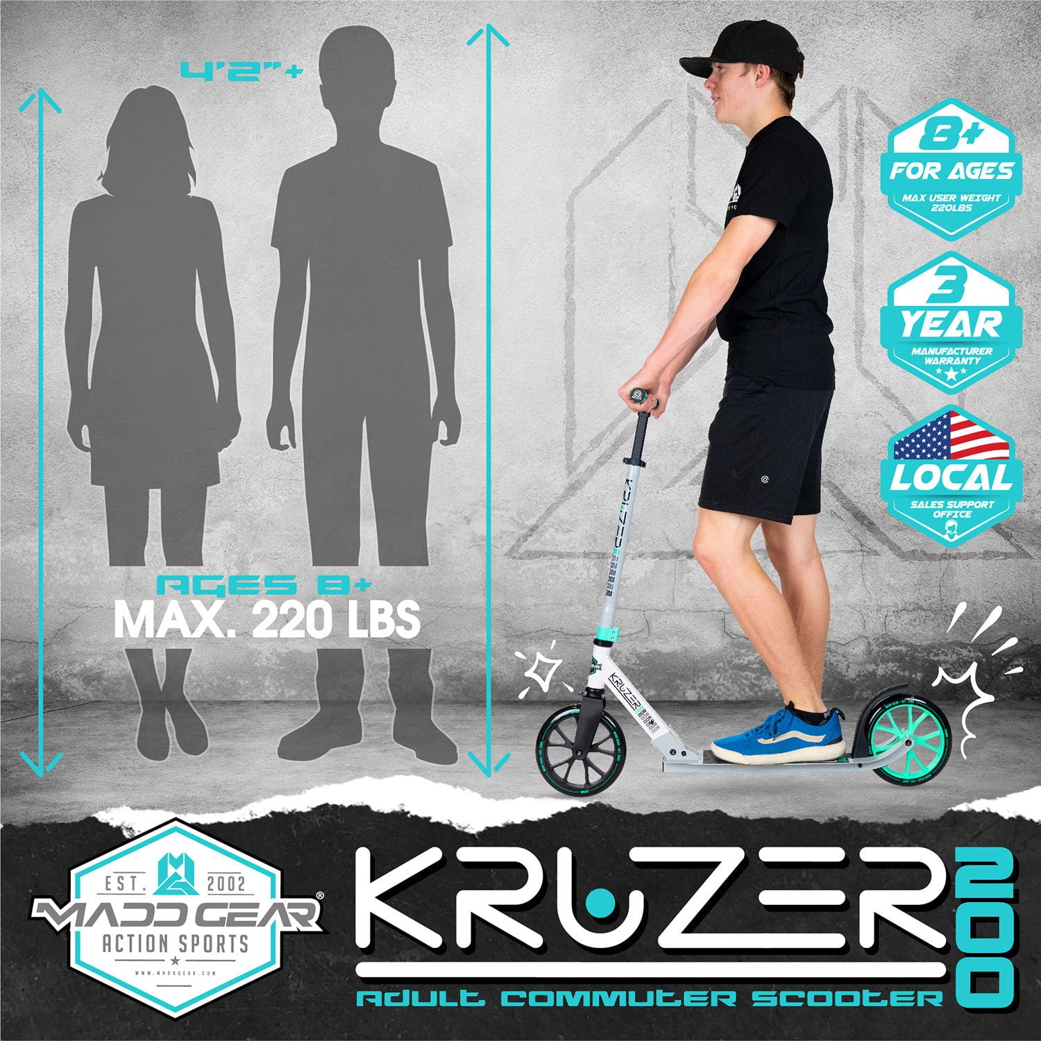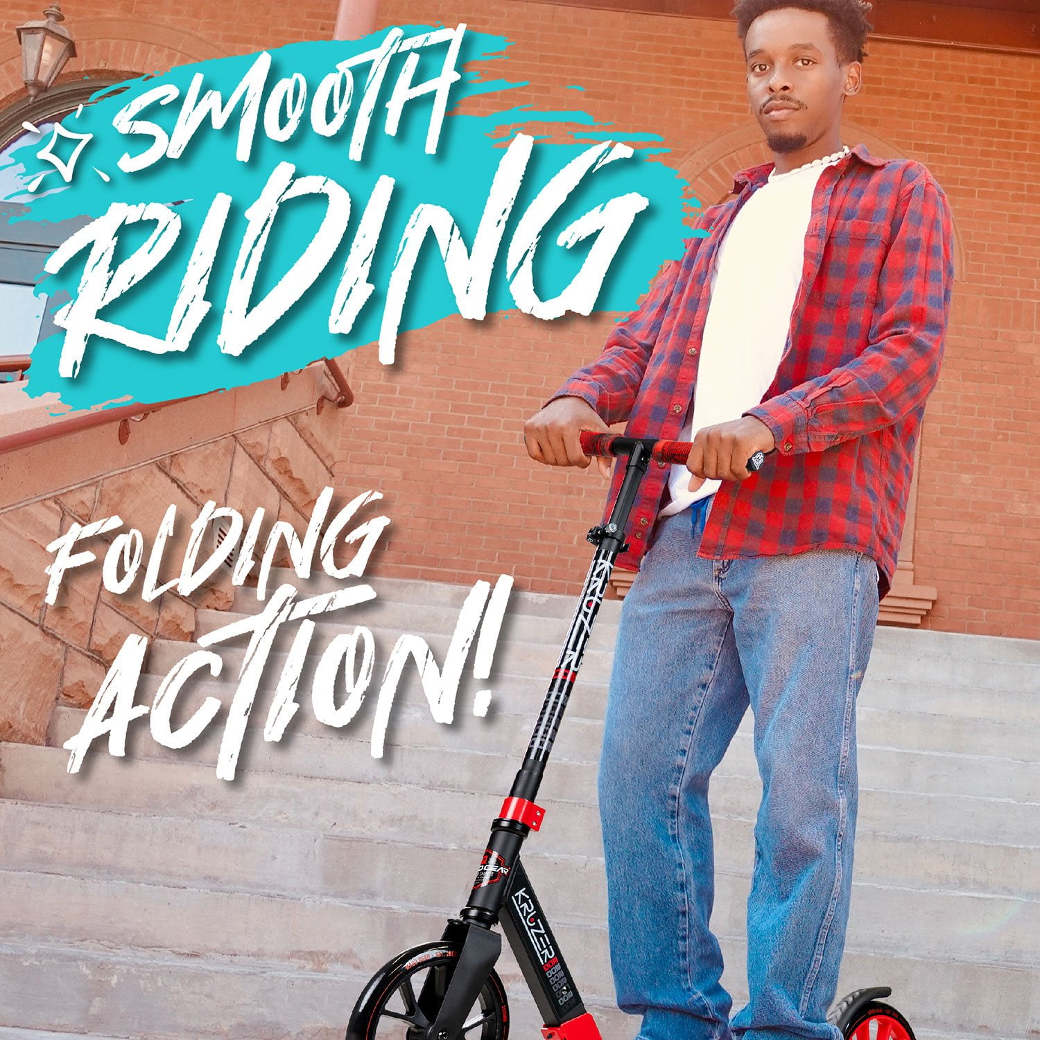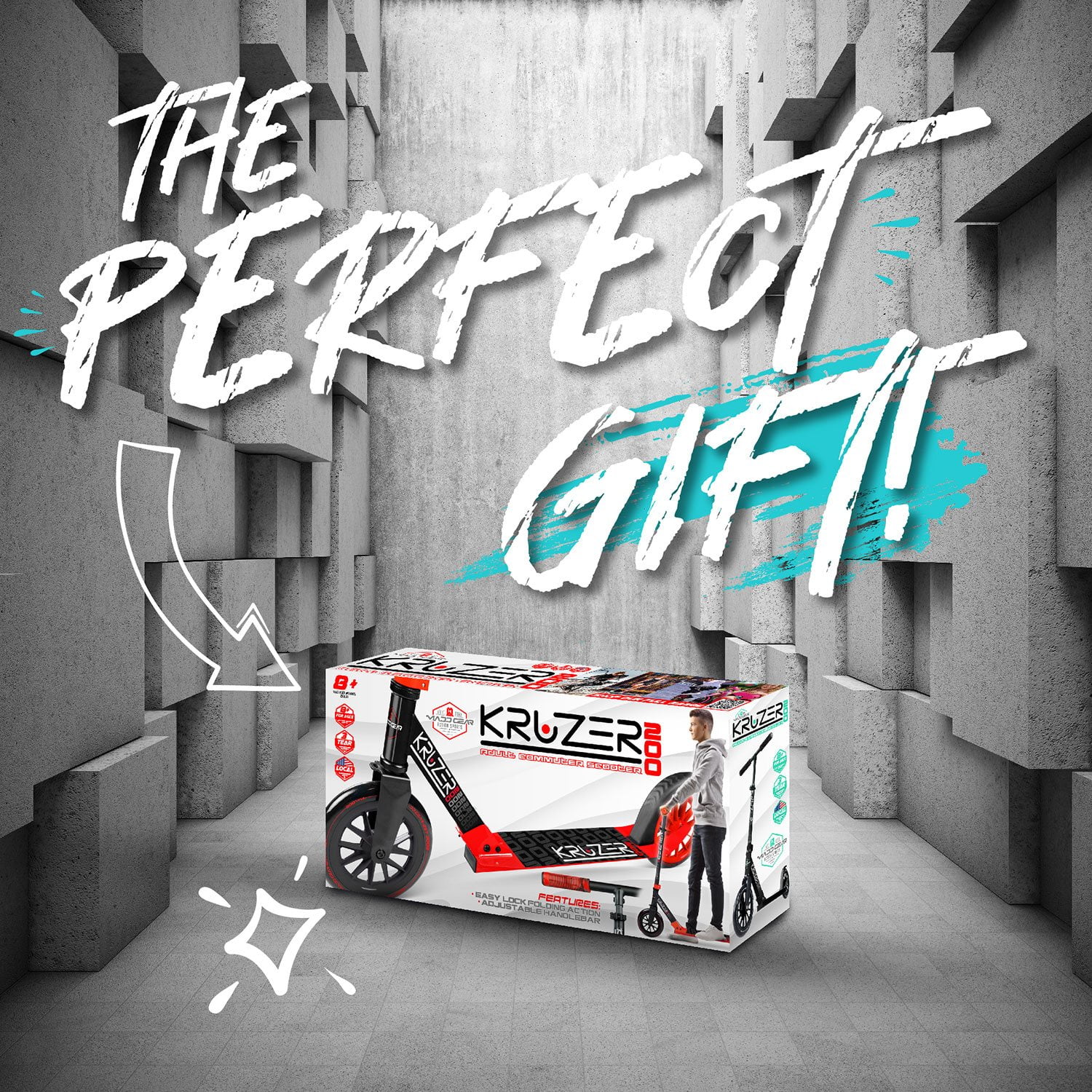 The Madd Gear Kruzer 200 Folding Height Adjustable Commuter Scooter is the ultimate big kid or adult scooter with large 200mm smooth-rolling wheels. Glide along effortlessly to keep up with the kids, cruise the boardwalk at the beach or even commute to school, work, or college. An adjustable handlebar makes the Madd Gear Kruzer 200 Scooter ideal for any rider age 8 years and up. The Easy-Fold System makes it quick and convenient to stow and go while the kickstand allows the Kruzer 200 to be parked anywhere. Fitted with comfortable and durable soft foam grips and a quick stop rear brake, you’ll always be in control and riding in comfort. The long foot platform is designed for larger feet and makes for a comfortable platform for extended rides but still compact enough to stow away under the bed or in the trunk of the car.