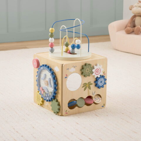 • Each side of the cube has a different game: a bead maze, shape sorter, gear wheel, and more. Little ones love turning it around again and again, engaging with a different side each time