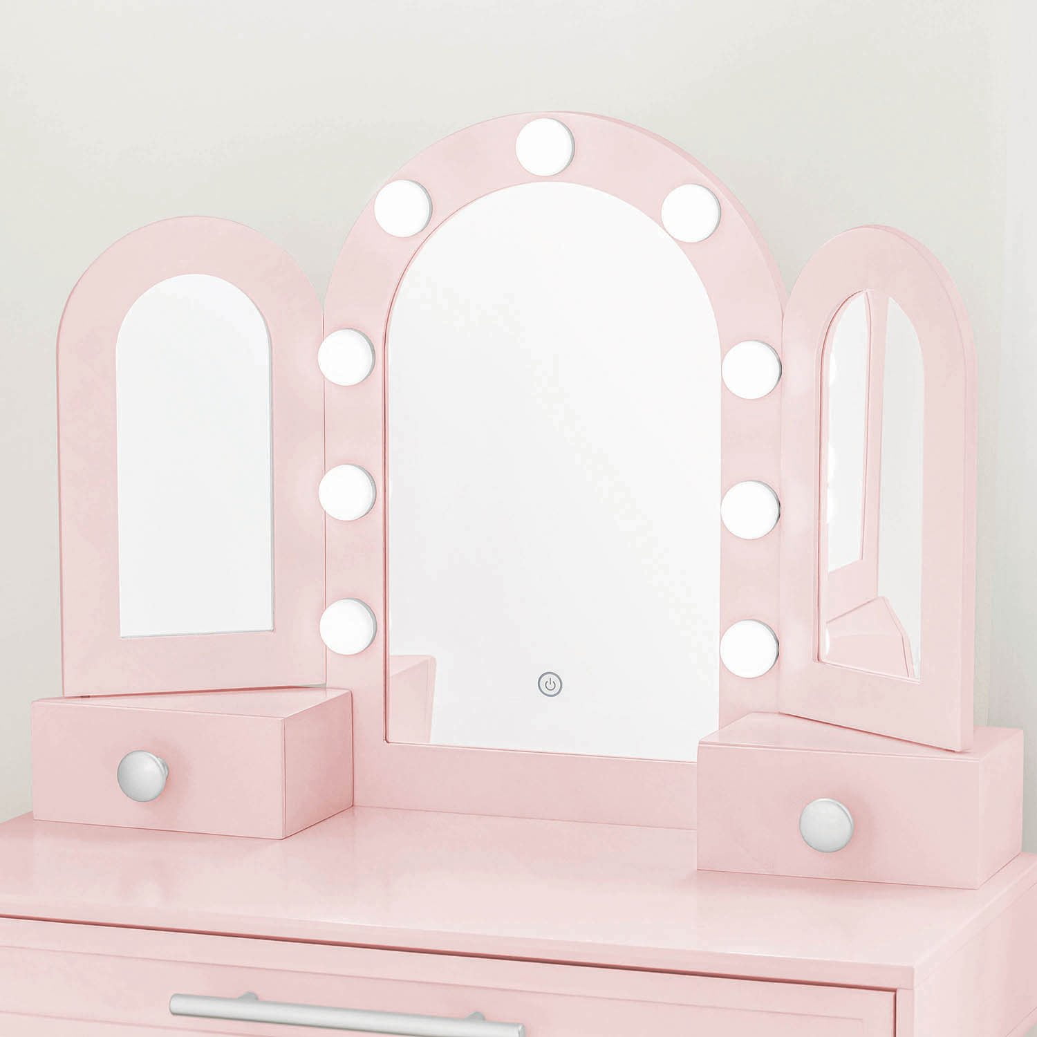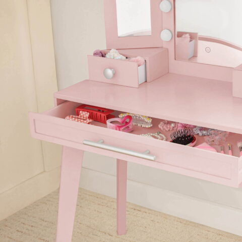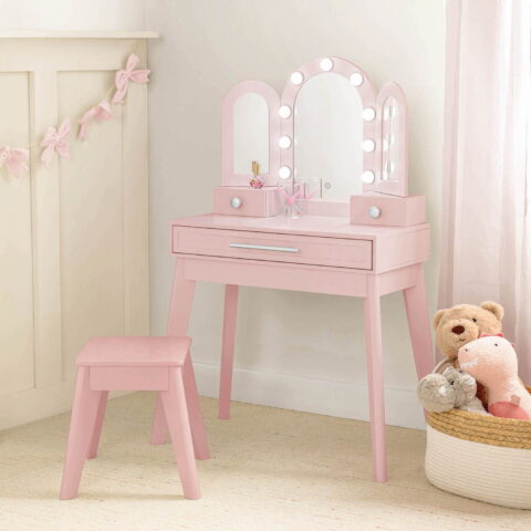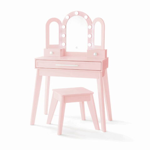 Keep your child’s treasures organized with the vanity table’s storage options. A large central drawer below the tabletop is perfect for brushes, hair accessories, and other items, while two smaller drawers under the side mirrors offer additional space for essentials. This thoughtful design ensures everything has its place.
