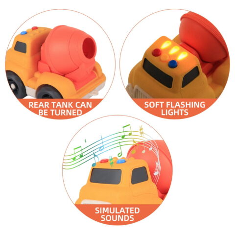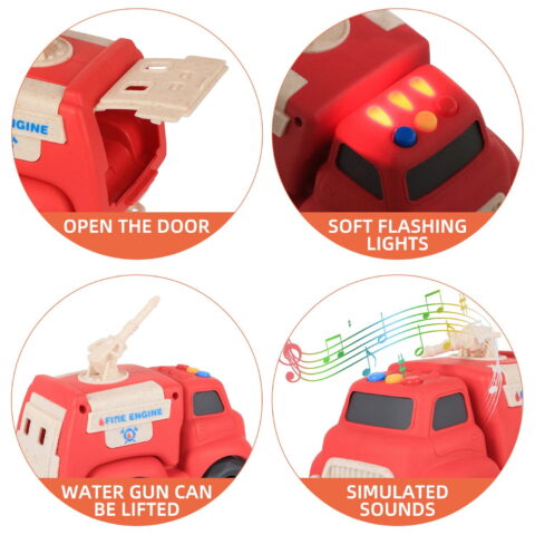 These vehicles are designed to be interactive and engaging. Each vehicle is fitted with soft flashing lights on the roof and three buttons that make different sounds, adding to the fun. The fire truck features a water gun that can be lifted and a rear compartment door that opens. The recycling truck also has an openable rear compartment door. The cement truck’s rear tank can be turned, and the dump truck has a rear bucket that can be tilted 90 degrees. These features make playtime more exciting and engaging for your child.